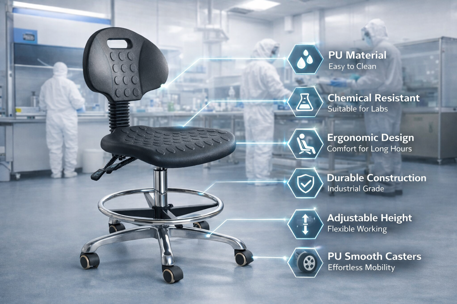 Durability is another reason polyurethane laboratory chairs are widely used. Industrial environments require furniture that can withstand heavy daily use. Polyurethane seats resist wear, chemicals, and punctures, making them ideal for laboratories, cleanrooms, and electronics manufacturing facilities.